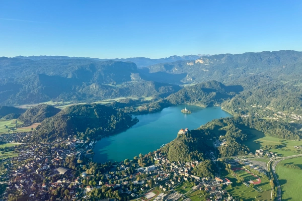 Preletite Blejski otok in nadaljujte s panoramskim poletom čez Julijske Alpe proti najvišji gori Slovenije – Triglavu (2864m). Uživajte v slikovitem razgledu na Triglav in okoliško naravo s številnimi planinskimi postojankami.